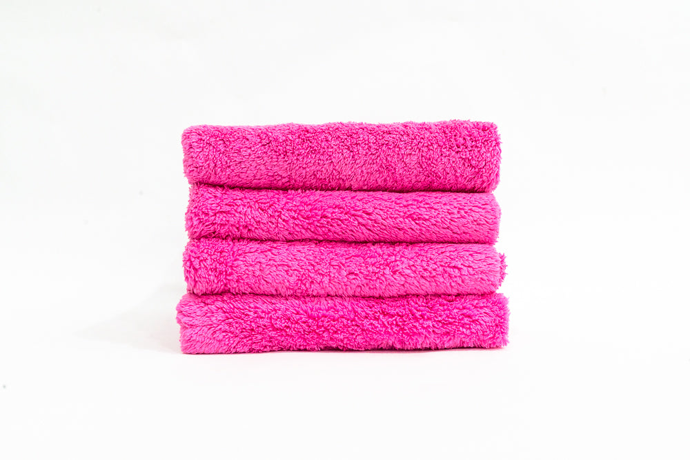 Fluffy Ultra Soft Edgeless Microfiber Towel 480 GSM is a soft and fluffy pink detailing towel that is the perfect quality and size for Ceramic Coating or for washing your vehicle. It's a must have in your detailing arsenal. The edgeless design means no harsh edges to scratch your paint, and the 480 GSM ensures top-of-the-line absorbency. Fluffy Ultra Soft Edgeless Microfiber Towel 480 GSM 16 x 16 inches in Pink - 4 pack.